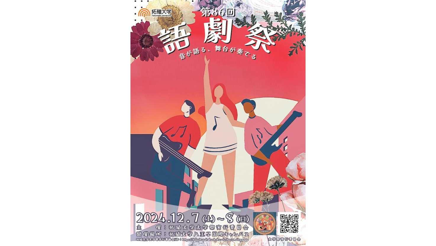 【拓殖大学】学生3大祭典である「語劇祭」を12月7日(土)~8日(日)に開催。アラビア語・インドネシア語・中国語による外国語劇を実施。 拓殖大学 2024年11月29日 08:05 拓殖大学は、「語劇祭」を12月7日(土)~8日(日)の2日間八王子国際キャンパスにて開催します。今年度のキャッチフレーズは『音が語る、舞台が奏でる』でハイブリット形式により実施予定です。参加は申込不要です。 【語劇祭 概要】 1.日 時 12月7日(土)10:00 ~ 14:05 12月8日(日)10:05 ~ 14:50 2.会 場 ・拓殖大学 八王子国際キャンパス「麗澤会館90年記念ホール」 ・Web配信(オンライン) 3.内 容 外国語劇発表団体(5団体3カ国語) ・アラビア研究会(アラビア語) ・インドネシア研究会(インドネシア語)※事前収録した動画を上映 ・中国研究会(中国語) ・政経学部渡邉俊彦先生ゼミナール(中国語) ・外国語学部関口美幸先生ゼミナール&動画制作愛好会&有志(中国語) 文化活動発表団体(3団体) ・アカペラ同好会 ・ビートルズ研究愛好会 ・K-POP愛好会 4.主 催 拓殖大学 大学祭実行委員会 その他の詳細及びWeb配信アドレスは以下URLよりご確認ください。 https://act.takushoku-u.ac.jp/news/nid00004535.html ▼本件に関する問い合わせ先 拓殖大学 広報室 TEL:03-3947-7160 メール:web_pub@ofc.takushoku-u.ac.jp 【リリース発信元】 大学プレスセンター https://www.u-presscenter.jp/
