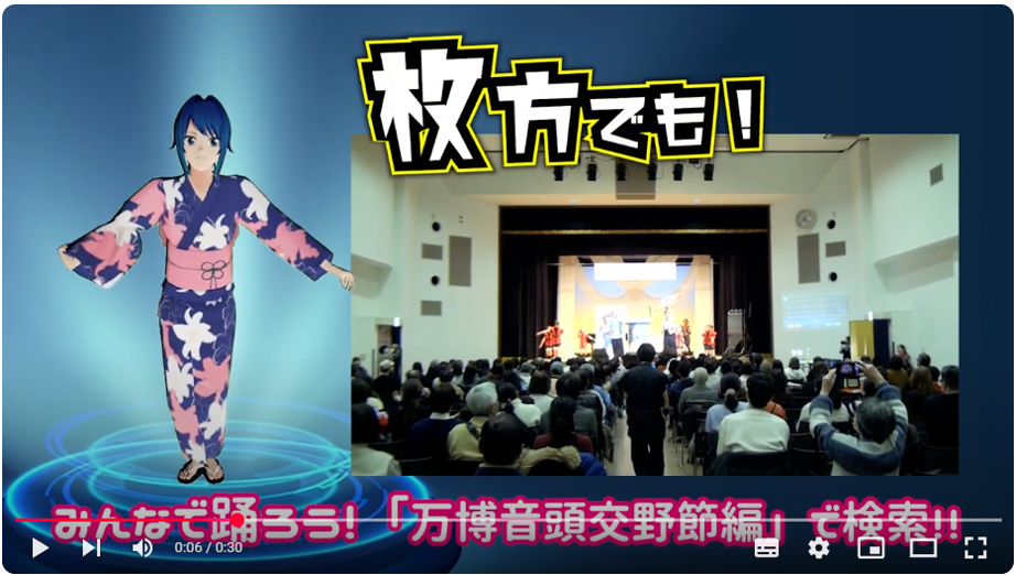 万博彩る盆踊りCGアニメを学生が製作 紹介動画を枚方市役所前など11カ所で放映中 -- 大阪工業大学 大阪工業大学 2025年03月03日 14:05 大阪工業大学(学長:井上晋)情報メディア学科のインタラクションデザイン研究室(指導教員:佐野睦夫教授)が製作した「万博音頭交野節編」のCGアニメが、枚方市役所前など同市内11カ所のデジタルサイネージで放映されています。大阪・関西万博まであと1カ月に迫ったタイミングで、街角から開幕ムードを盛り上げています。 【本件のポイント】 ● 万博を彩る盆踊りのCGアニメを、モーションキャプチャー技術を使い学生が製作 ● 枚方市を拠点に活動する盆踊りチームと連携した取り組み ● CGアニメも登場する踊りの紹介動画を枚方市役所前など11カ所で放映中 枚方市の「ひらかた万博共創プラットフォーム」で本学は盆踊りチーム「スターダスト河内」と出会い、盆踊りを通じた大阪・関西万博の盛り上げに取り組むようになりました。枚方を拠点に活動する同チームは、河内音頭をはじめ、そのルーツとなる枚方・交野に古くから伝わる盆踊り文化を継承して発信し、大阪・関西万博では「#万博音頭プロジェクト」に参画して「万博音頭交野節編」も製作しています。 交野節編の踊りを多くの人に親しんでもらえるよう、情報メディア学科の学生約15人がモーションキャプチャー技術を用いて振り付けのCGアニメを約10カ月かけて作りました。踊り手をカメラで撮影し、その映像から手の指や頭部も含めた3次元骨格情報を抽出。動きをCGキャラクターに当てはめ、音楽と同期させてアニメ映像として完成させました。苦労したのはアクション性の高いスピーディーな踊りを3次元情報として1台のカメラで正確に捉えることです。特に、動きを表現するには指の動きが重要な役割を果たしていることが分かり、何度も撮り直して最適な手法に到達しました。 完成したCGアニメは、4月27日にスターダスト河内が、大阪・関西万博会場TEAM EXPOパビリオンステージで万博音頭交野節編を踊る際、モニターで披露されます。現在は踊りを紹介する30秒動画の中に登場し、枚方市役所前や京阪枚方市駅前の市立総合福祉会館ラポールひらかた前など同市内11カ所のデジタルサイネージで放映されています。 ▼本件に関する問い合わせ先 常翔学園 広報室 石村、上田 住所:大阪市旭区大宮5丁目16番1号 TEL:06-6954-4026 メール:Koho@josho.ac.jp 【リリース発信元】 大学プレスセンター https://www.u-presscenter.jp/