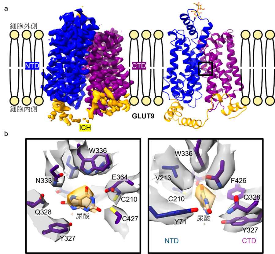 GLUT9の全体構造は、典型的な糖輸送体である他のGLUTファミリーメンバーと共通しており、12本の膜貫通ヘリックス(NTDとCTD)と5つの細胞内ドメイン(ICH)により構成されていました(図2a)。