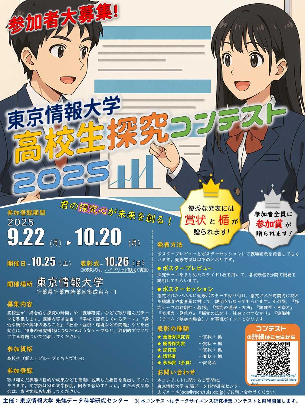 東京情報大学(設置者:学校法人東京農業大学)総合情報学部の先端データ科学研究センターでは、高校生課題探究コンテストを10月25日~26日に開催します。