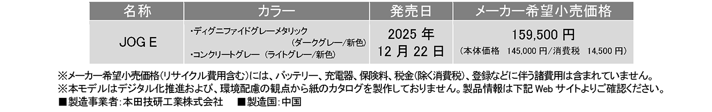 ヤマハ発動機販売株式会社は、電動スクーターの市販モデル「JOG E(ジョグ イー)」を2025年12月22日に東京・大阪の地域限定で先行発売します。