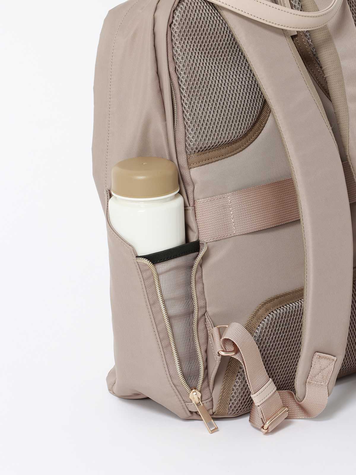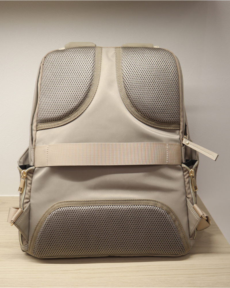 本企画は、時期を問わず蒸れを感じやすい背中や肩の不快感を軽減するため、背面クッションとショルダー内側にはメッシュ素材を取り入れました。また生地表面には撥水加工を施している他、メイン収納ファスナー部分には雨が入りにくいカバーもつけるなど、突然の雨でも安心な仕様となっています。その他上部浅めのポケットには、ハンディファンを入れることで、夏の暑さ対策も行える企画にしました。
