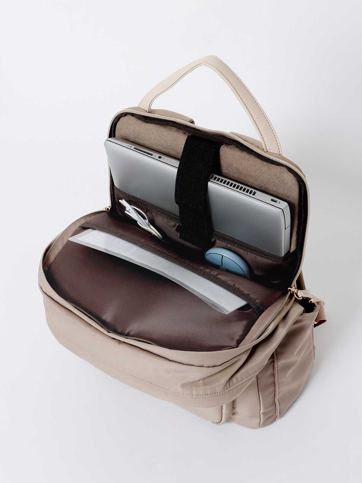 従来は14~15インチPCを収納できるサイズが中心でしたが、本企画は13.3インチPCやA4資料をスムーズに収納できる容量を確保しながら、見た目はコンパクトなサイズ感に仕上げました。ショルダー部分は、カジュアル過ぎない程よい太さに調整しつつ、従来品よりもクッション性を向上。またショルダーと背面部分は人間工学に基づき、メッシュクッションや体に沿うカーブを取り入れることで、肩や腰にかかる負担を軽減しました。そのため長時間背負っていても重さを感じにくく、働くビジネスパーソンを応援する企画となっています。