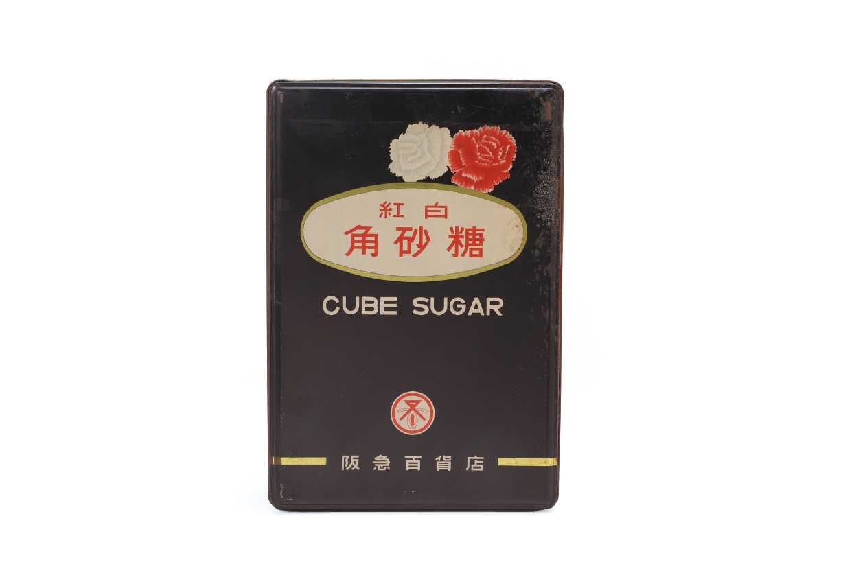 結婚式の引き出物などに用いられたと推察される角砂糖用のふた付き角型缶。