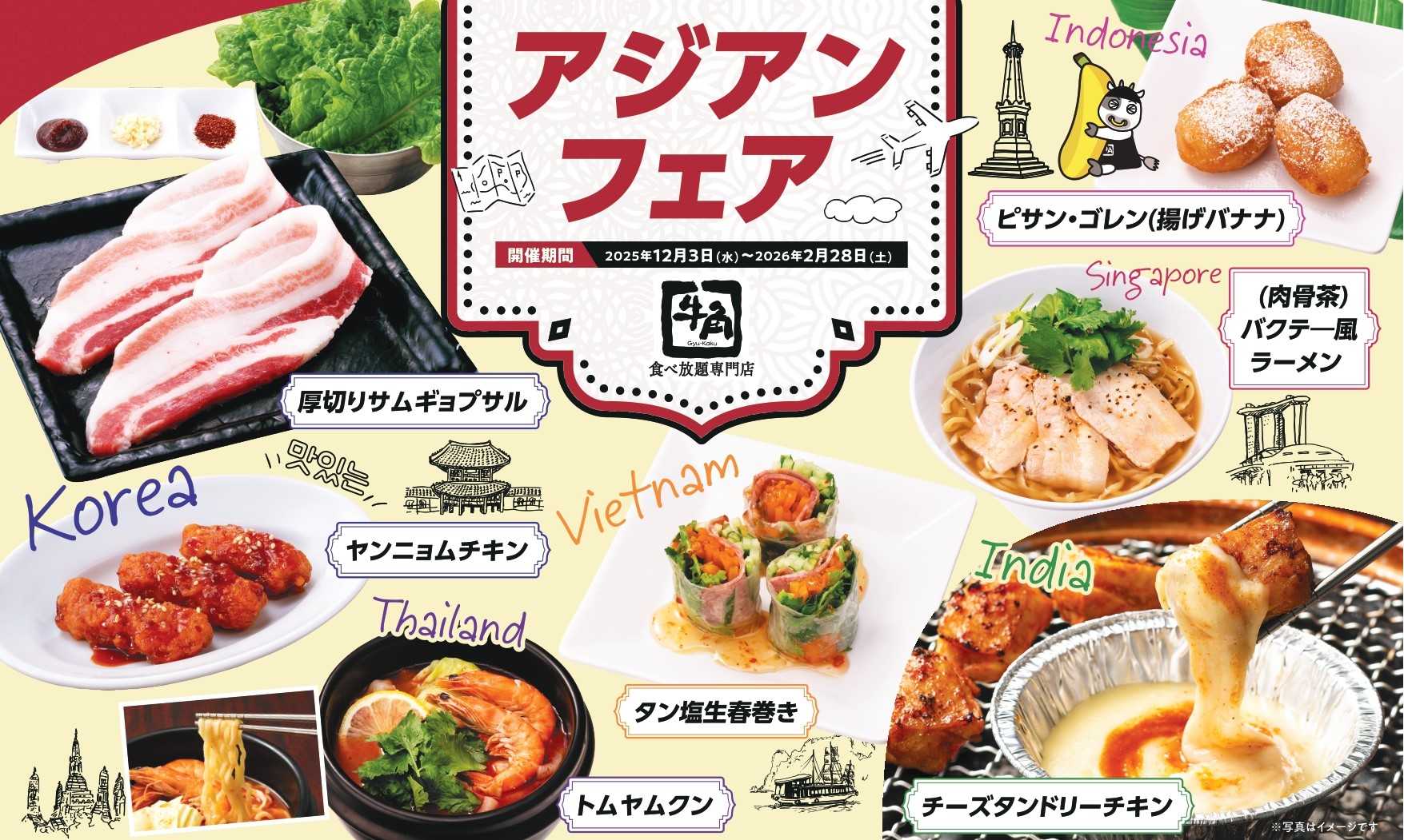 全6カ国の名物グルメを楽しめる「アジアンフェア」を開催しています。定番の食べ放題メニューに加え、韓国・タイ・シンガポールなどの名物メニューが登場し、1回の食事で“海外旅行気分”を味わえる体験型企画です。