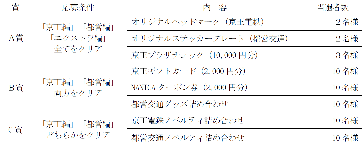 ・特設のイベントページにアクセスし、各章の「クリアキーワード」と必要事項を記入して応募すると、抽選で賞品が当たります。「京王編」または「都営編」の片方のみクリアされた場合でも応募は可能です。さらに両方をクリアすると応募できる商品の種類が増えます。加えて「エクストラ編」までクリアすれば、応募できる賞品の幅が広がりより多くのチャンスが得られます。