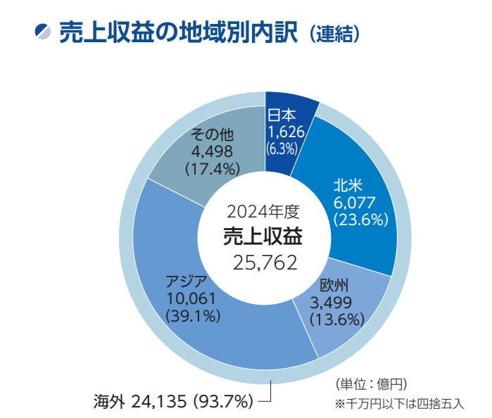 当社の売上収益の地域別内訳。海外比率は93.7%を占める (2024年12月期)