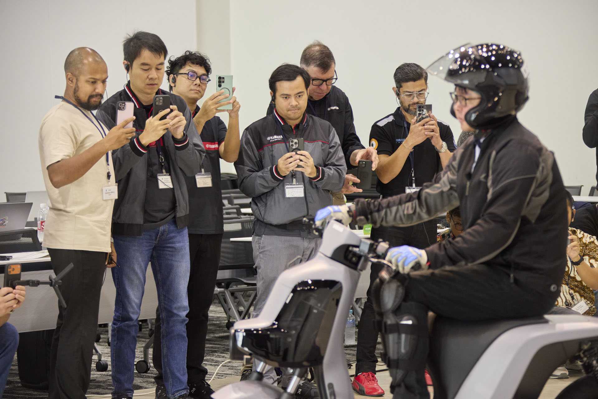 本社で行われた開発者プレゼン。電動スクーターのコンセプトモデル「ELOVE」を取材する海外メディアの記者の方々