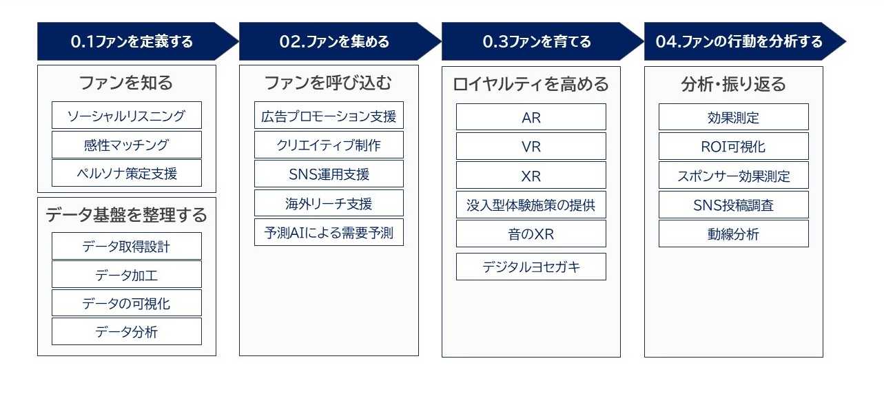 AIを用いた、ファンの反応を予測する分析ツール(予測分析AI「Prediction One」)や、消費者の感性や価値観を中心とした多角的なデータ分析(感性AI「SENZAI」 (*2))を提供します。