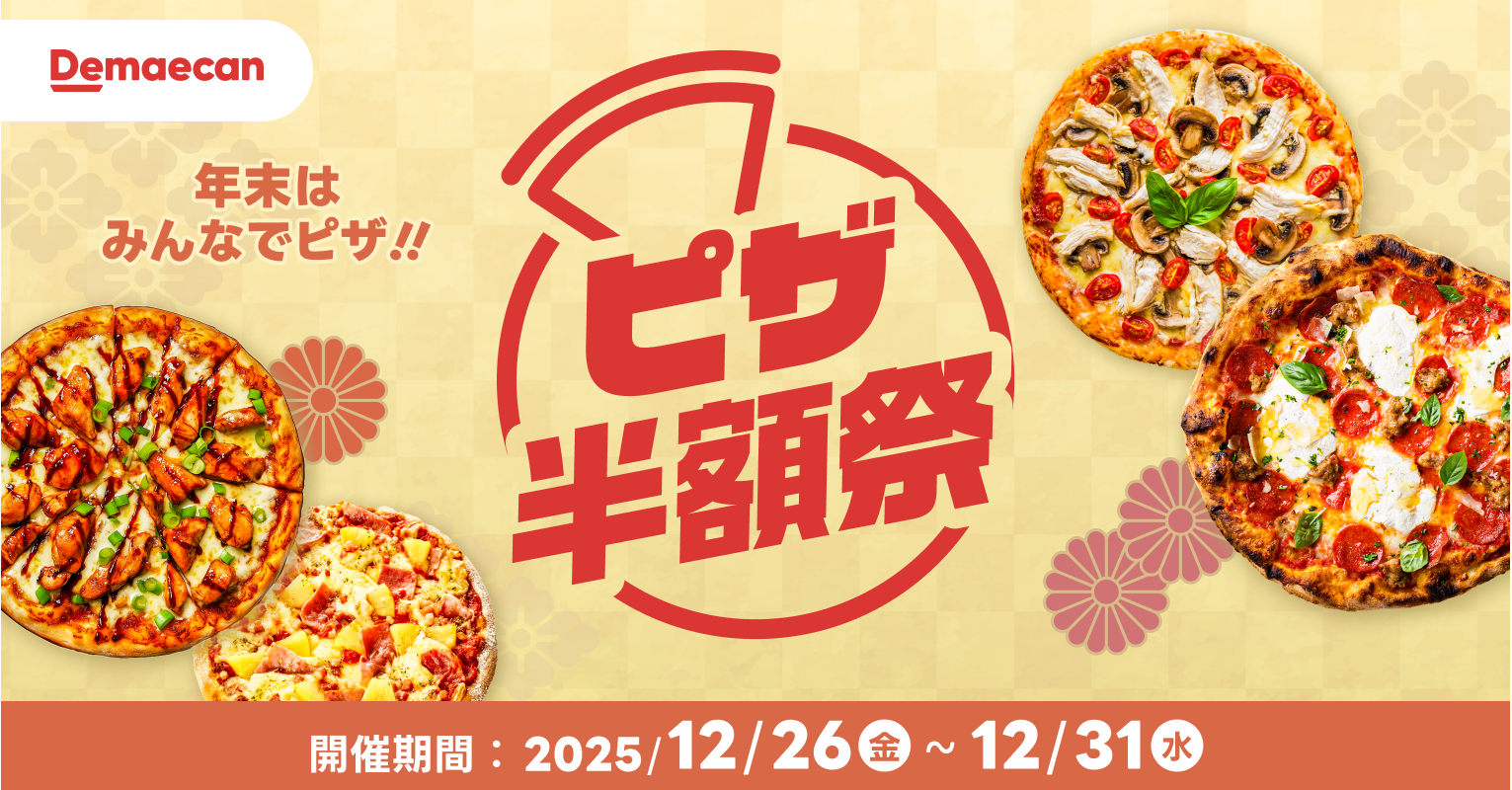 また、クリスマス後の2025年12月26日(金)〜31日(水)には、対象のピザが半額になる「ピザ半額祭」を開催いたします。出前館で注文された12月の人気ジャンルでは5年連続でピザが1位を獲得。種類も多く、大人数でもシェアしやすいことから、人が集まる機会にはピザが注文される傾向が強いことが分かります。