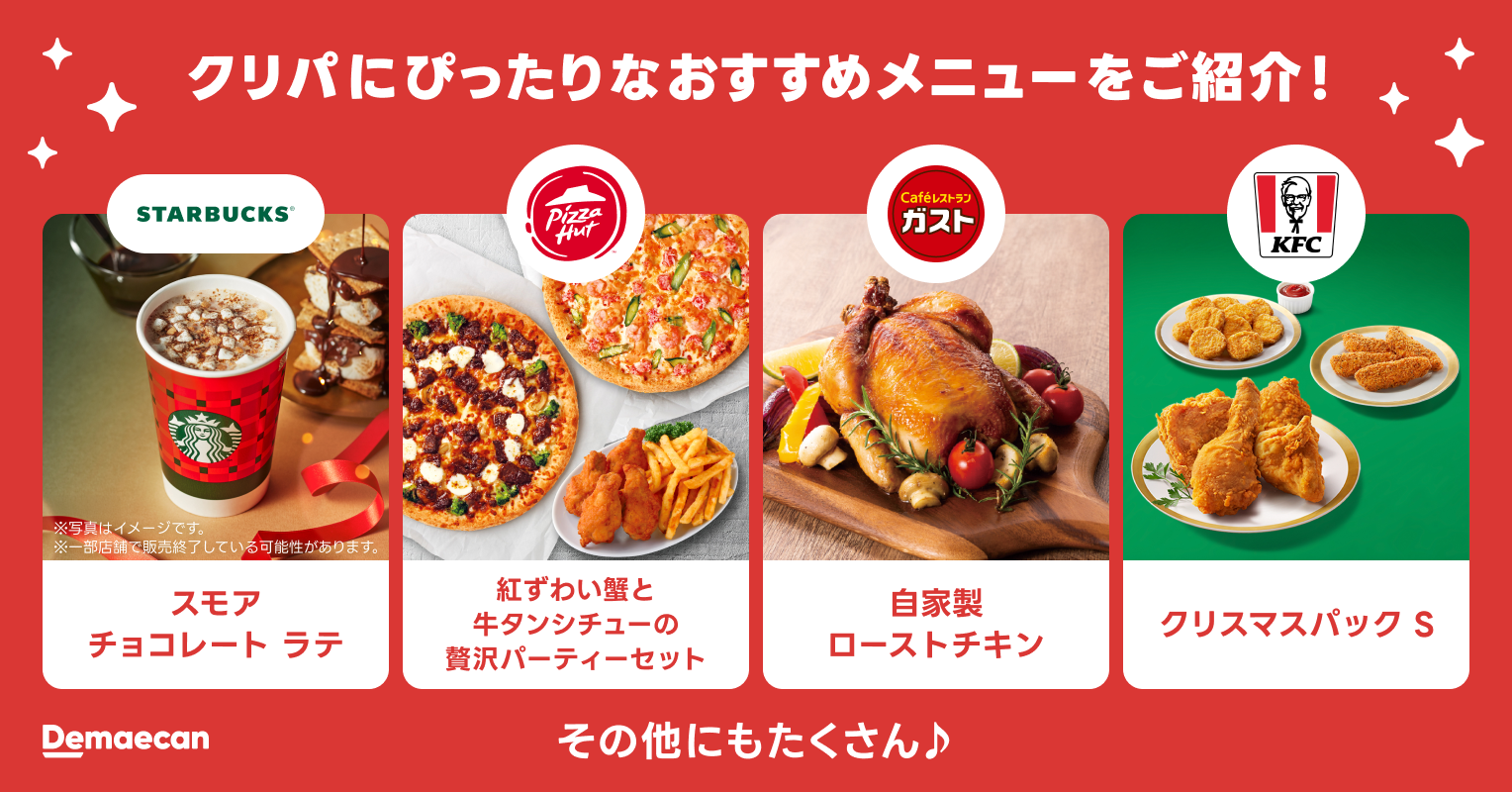特集ページでは、出前館でご注文いただける加盟店のクリスマスにぴったりなメニューをご紹介しております。スターバックスの『スモア チョコレート ラテ』や、ピザハットの『紅ずわい蟹と牛タンシチューの贅沢パーティーセット』、ガストの『自家製ローストチキン』、ケンタッキーの『クリスマスパック S』など、パーティーにピッタリなメニューが多数。大切なパートナーとのひとときや、気のおけない友人との集まり、あるいは自分へのご褒美など、さまざまなシーンでお楽しみいただけるラインナップです。