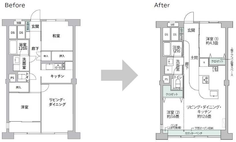 物件の写真を見た時に「マンションだな」と感じさせる2大要因は、天井の梁と窓枠の金物だと私は思っています。こちらの事例は、存在感のある木材の棚を窓際に造作することで、窓枠や構造体の印象がほぼゼロになって、まるで素敵な一軒家の邸宅のようです。