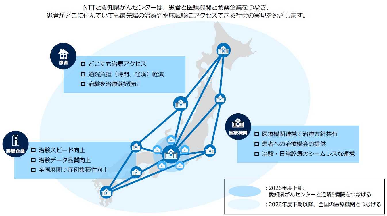 両者は、治験領域にとどまらず、愛知県がんセンターと地域病院・クリニックをセキュアに接続し、治験情報以外の診療情報も安全に共有できる仕組み(医療機関連携のバーチャルネットワーク)を共同で構築します。これにより、地域医療機関とがん専門医療機関の連携を強化し、患者ががんと診断された初期段階から、治験や高度専門医療など適切な治療にアクセスできる環境を整備します。