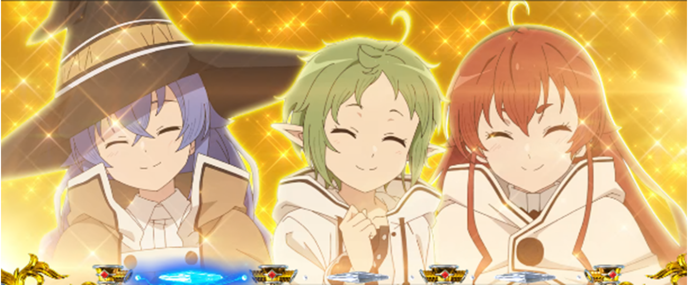 主人公ルーデウスをはじめ、3人のヒロイン、ロキシー、シルフィエット、エリスたちの活躍を、TVアニメの映像に加えてパチスロオリジナルの新規映像にて構成しています。特に、TVアニメにはないヒロインたちが共演するシーンは、パチスロでしか見られない映像となっています。