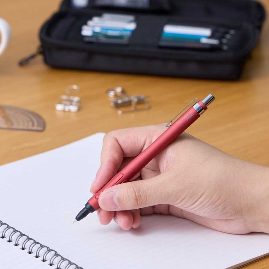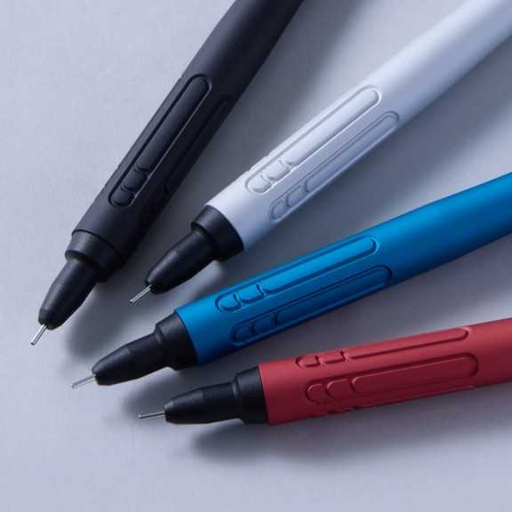 また、金属切削加工で刻まれたグリップ部分の溝が指先をしっかり捉え、滑りにくさを実現、無駄をそぎ落としたシンプルなデザインでありながら、優れた握り心地を兼ね備えています。筆記時に手に当たりにくい短めのクリップや、高い視認性を確保したペン先など、書くために最適な仕様となっています。