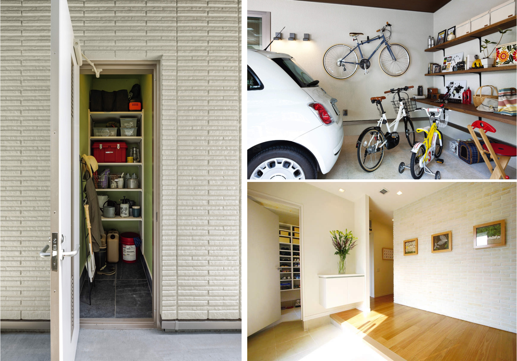 主に外部で使う物を収納するスペースとして、庭など屋外に設置する物置のほかに、屋外から直接アクセスできる建物本体に設けた収納、ビルトインガレージ内の収納、玄関土間収納を広めにとるなどがあります。