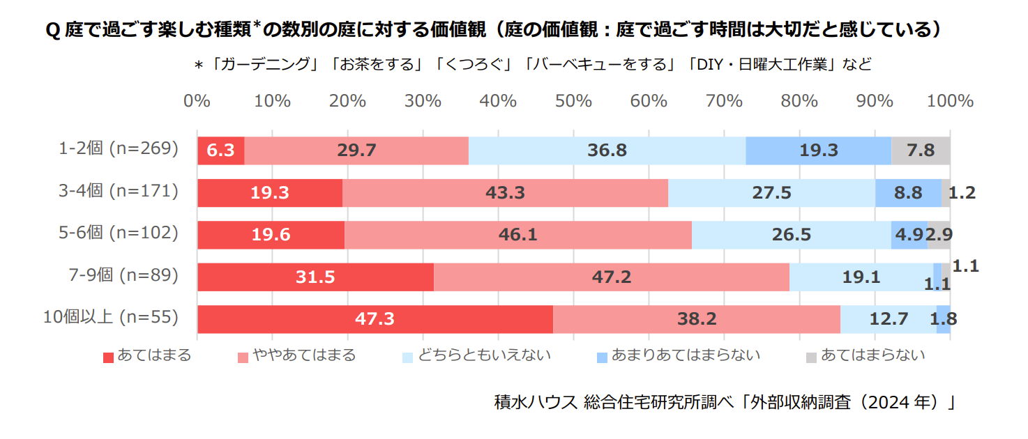 ここまで、5つのテーマに分けてライフステージと持ち物の関係性を調査した結果、ライフステージに合わせた持ち物の傾向が見られ、外や庭での楽しみ方が変化していくことが読み取れました。最後に、庭に対してどのような価値観を持っているかについても調査したところ、「ガーデニング」「お茶をする」「くつろぐ」「バーベキューをする」「DIY・日曜大工作業」など、庭で過ごす楽しむ種類が豊富なほど、庭で過ごす時間が大切だと感じる、つまり庭への価値観が高まる傾向にあることがわかりました。家族やライフステージの変化に合わせて様々な庭の楽しみ方ができるよう、将来を見据えた外部収納計画を考える必要があると言えます。