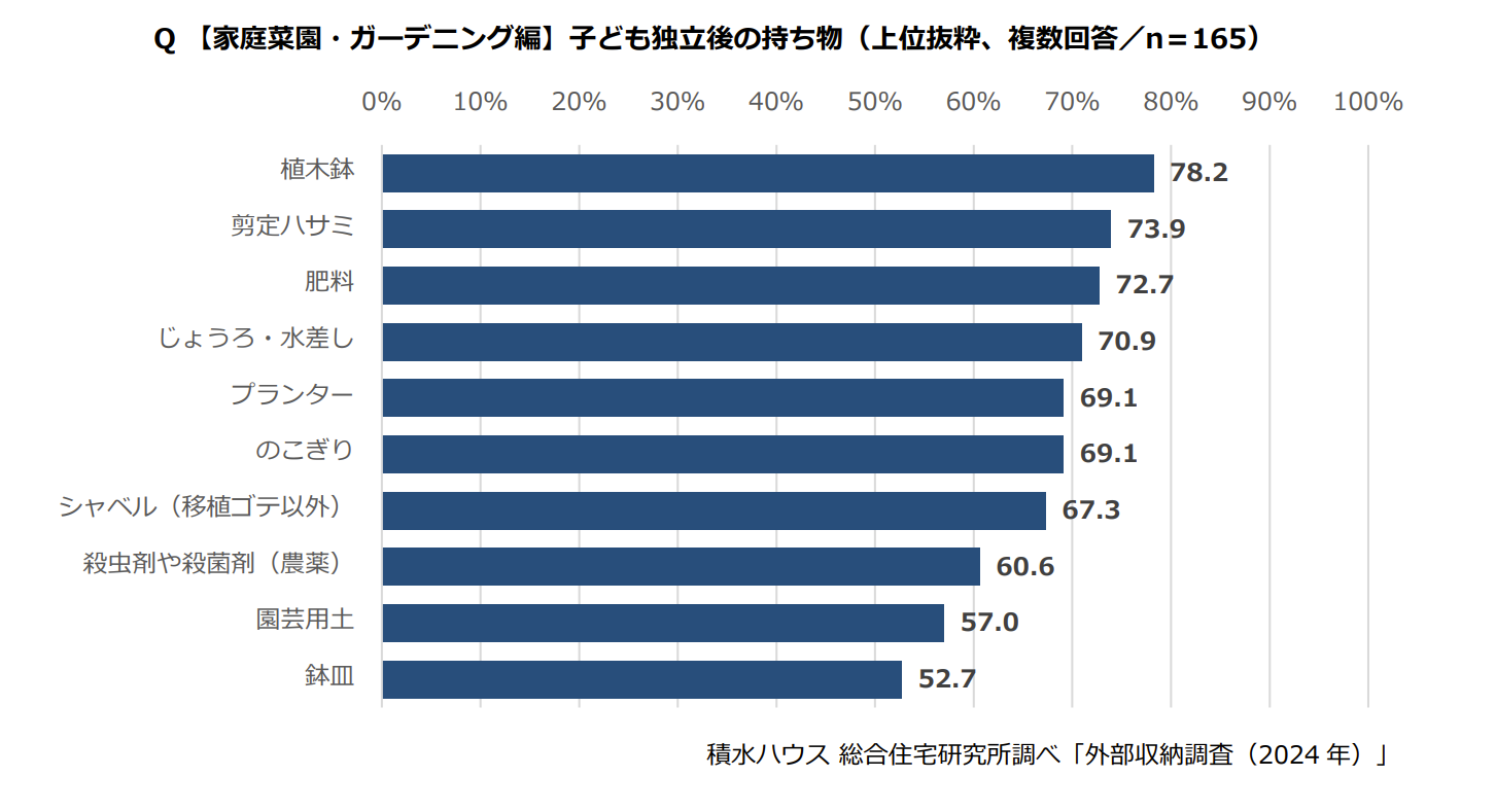 さらに、家庭菜園やガーデニングに関する持ち物についても調査しました。子どもが独立した世帯では、家庭菜園やガーデニングに用いる基本的なアイテムの所有率が高く、 上位に挙がったアイテムはいずれも半数以上が所有していることがわかりました。