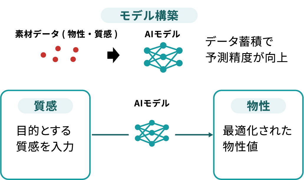 蓄積された素材の質感データと物理特徴量の相関関係をもとにAIが予測モデルを構築。未知の素材開発におけるシミュレーションが可能になります。
