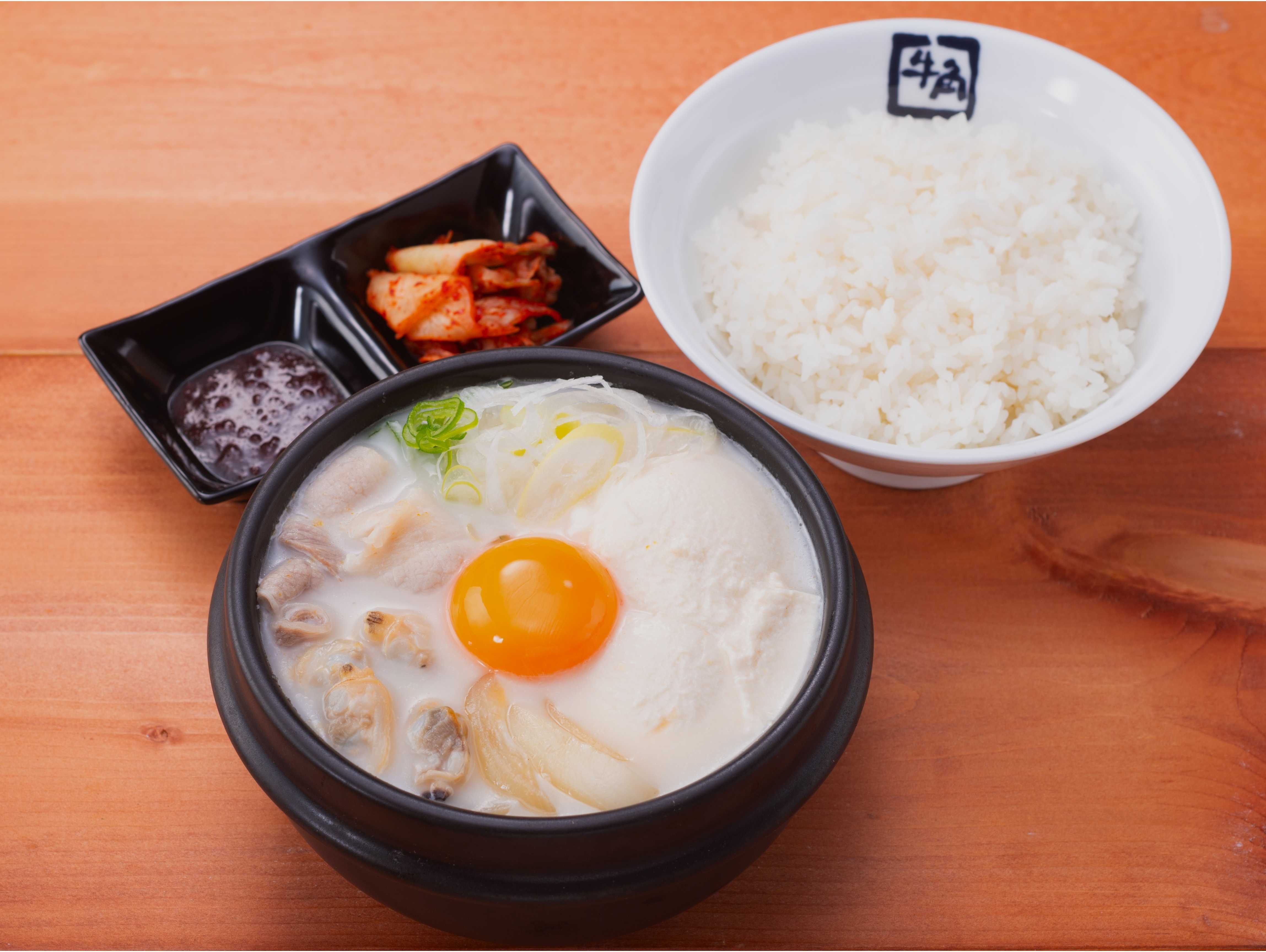 ベースとなるのは、“牛”の旨味をじっくり引き出した韓国伝統のスープ「コムタン」。牛角焼肉食堂では、ここに旨味食材の“あさり”を加え、牛のコクと貝の旨味が重なり合う、濃厚でありながらやさしい味わいの“辛くないチゲ”に仕立てました。さらに卵黄を加えることで、まろやかさと奥行きのあるコクをプラスしています。提供は、定番メニュー『石鍋豆富チゲ定食』でもおなじみの石鍋。熱々の状態で提供されるコムタンには、豆富、豚肉、あさり、ねぎなどの具材をたっぷりと使用し、食べ応えのある仕上がりに。また、別皿で添えた『キムチ』と『旨辛だれ』をスープに加えることで味の変化も楽しめます。まろやかな味わいの中にほどよい辛味が加わり、一度で二度の美味しさをお楽しみいただけます。