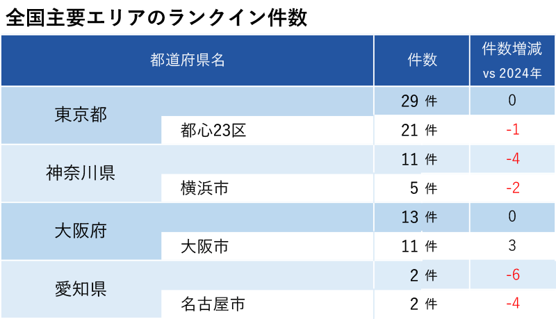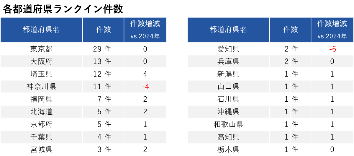 都道府県ランクイン件数は東京都が横ばいで首位、埼玉は 12 件(+4)、愛知は 2 件(-6)と大幅減少