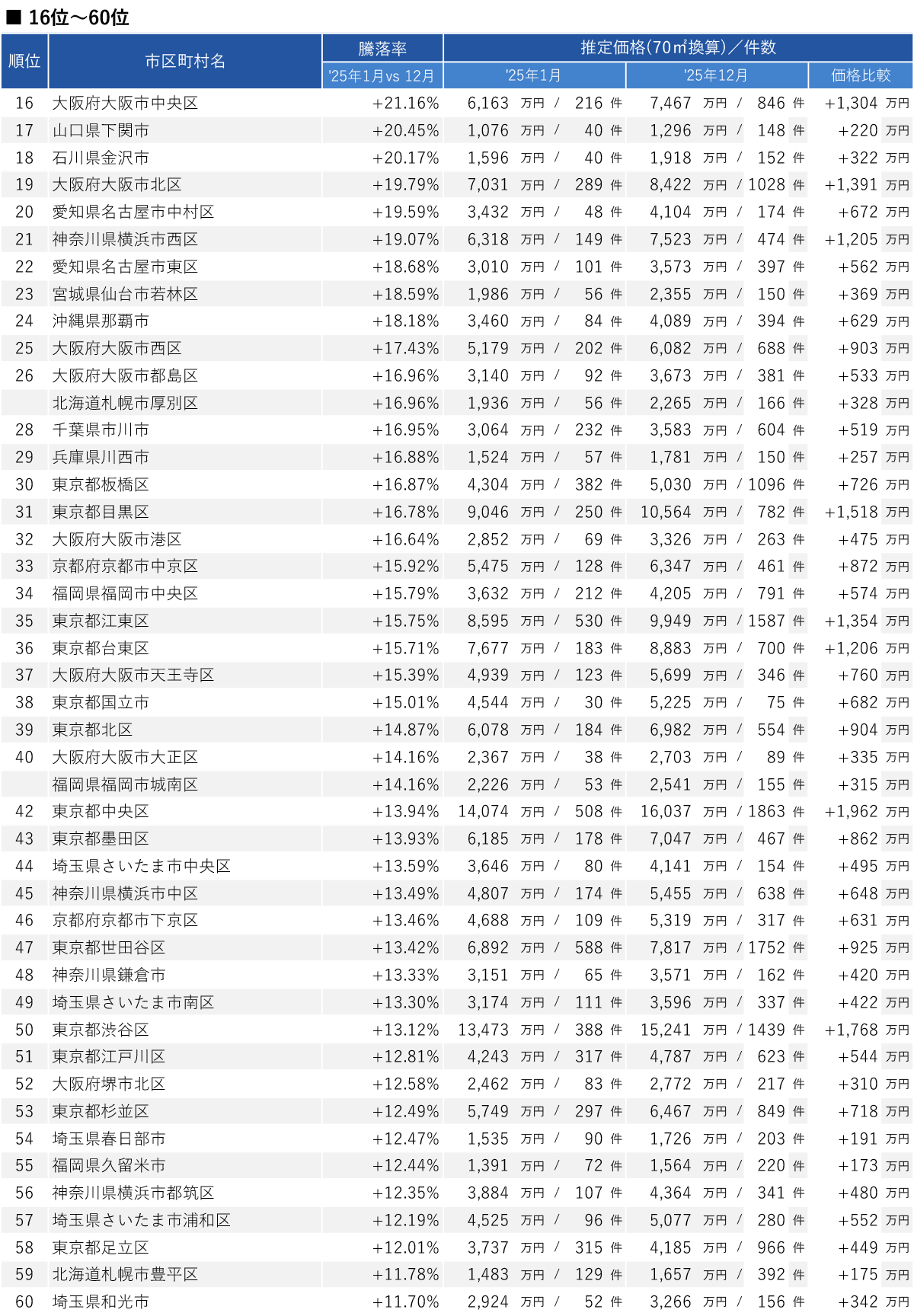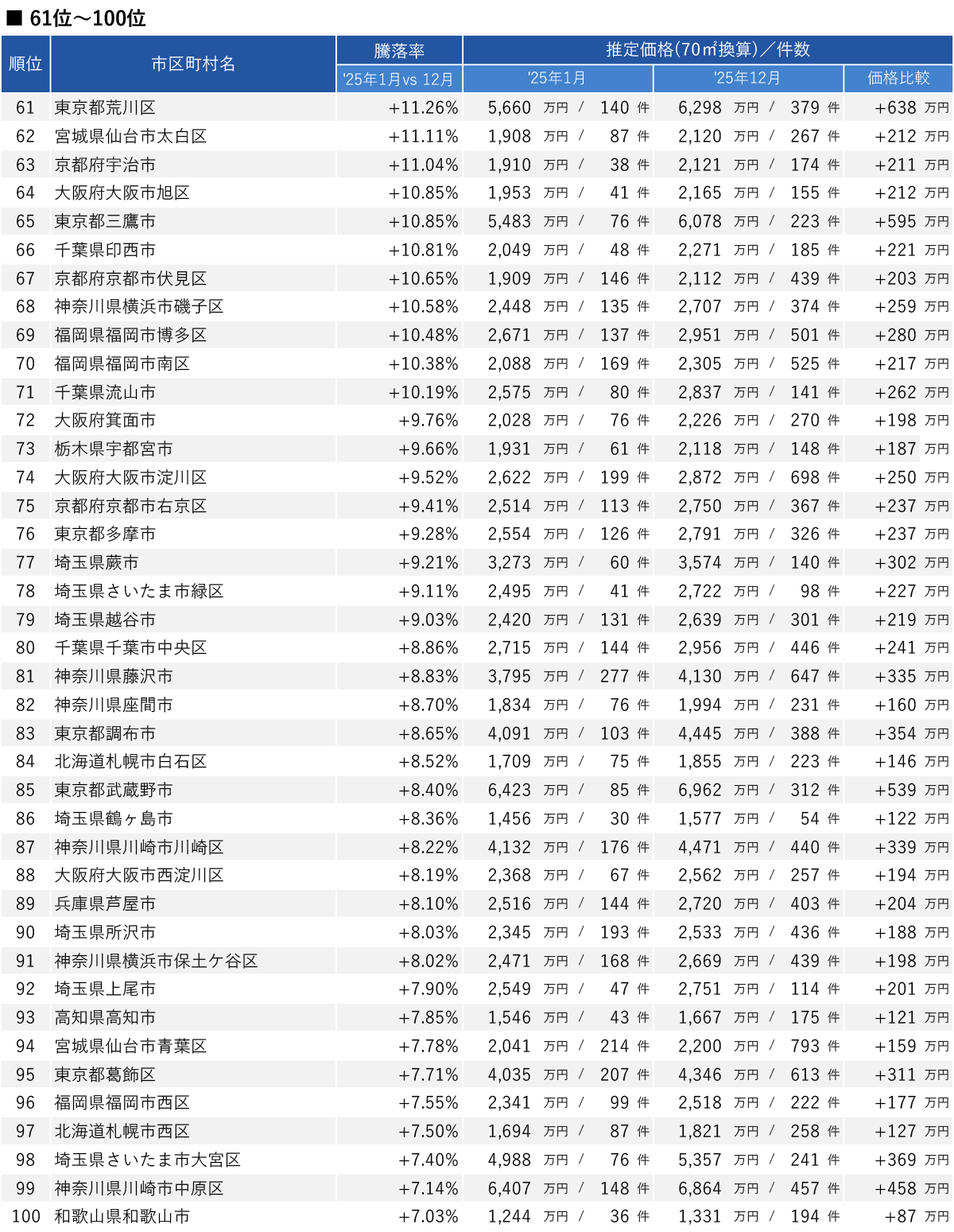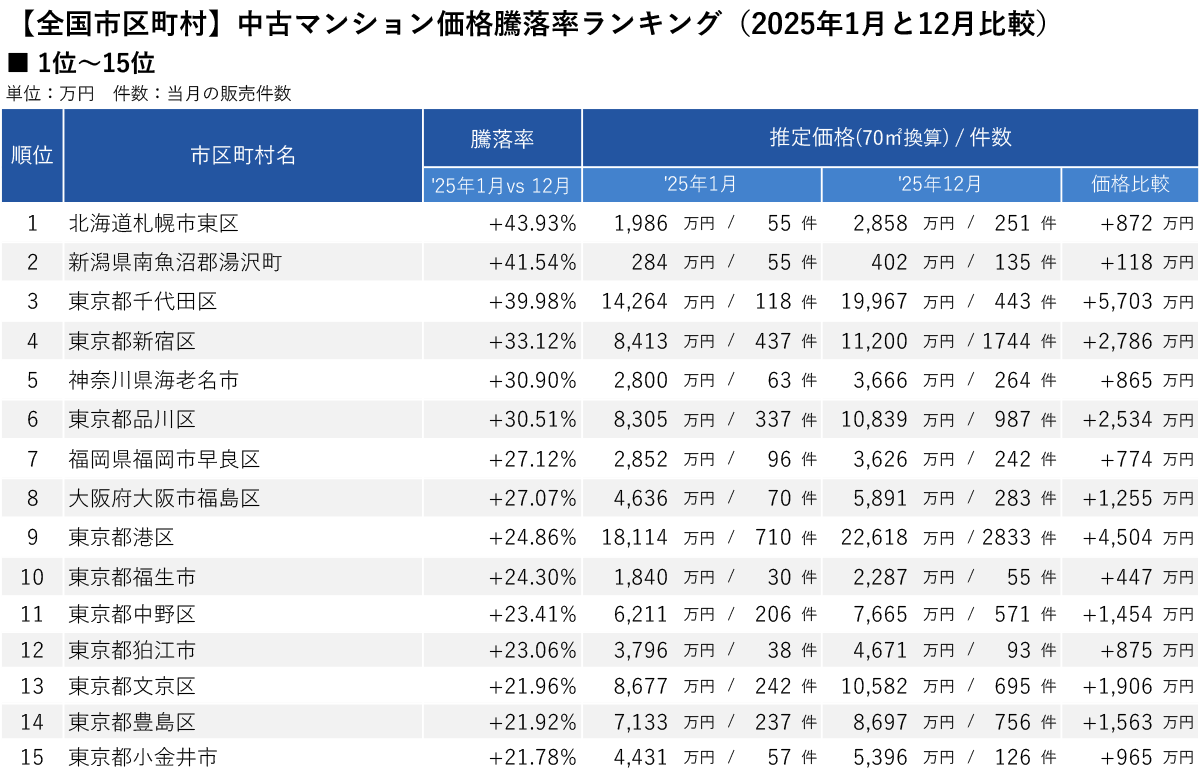 • 1位「北海道札幌市東区」は2025年単年で+43.93%(+872万円)と上昇率トップ。価格は2,858万円まで上がり、販売件数も 55 件から 251 件と約 4.6 倍に増えた。