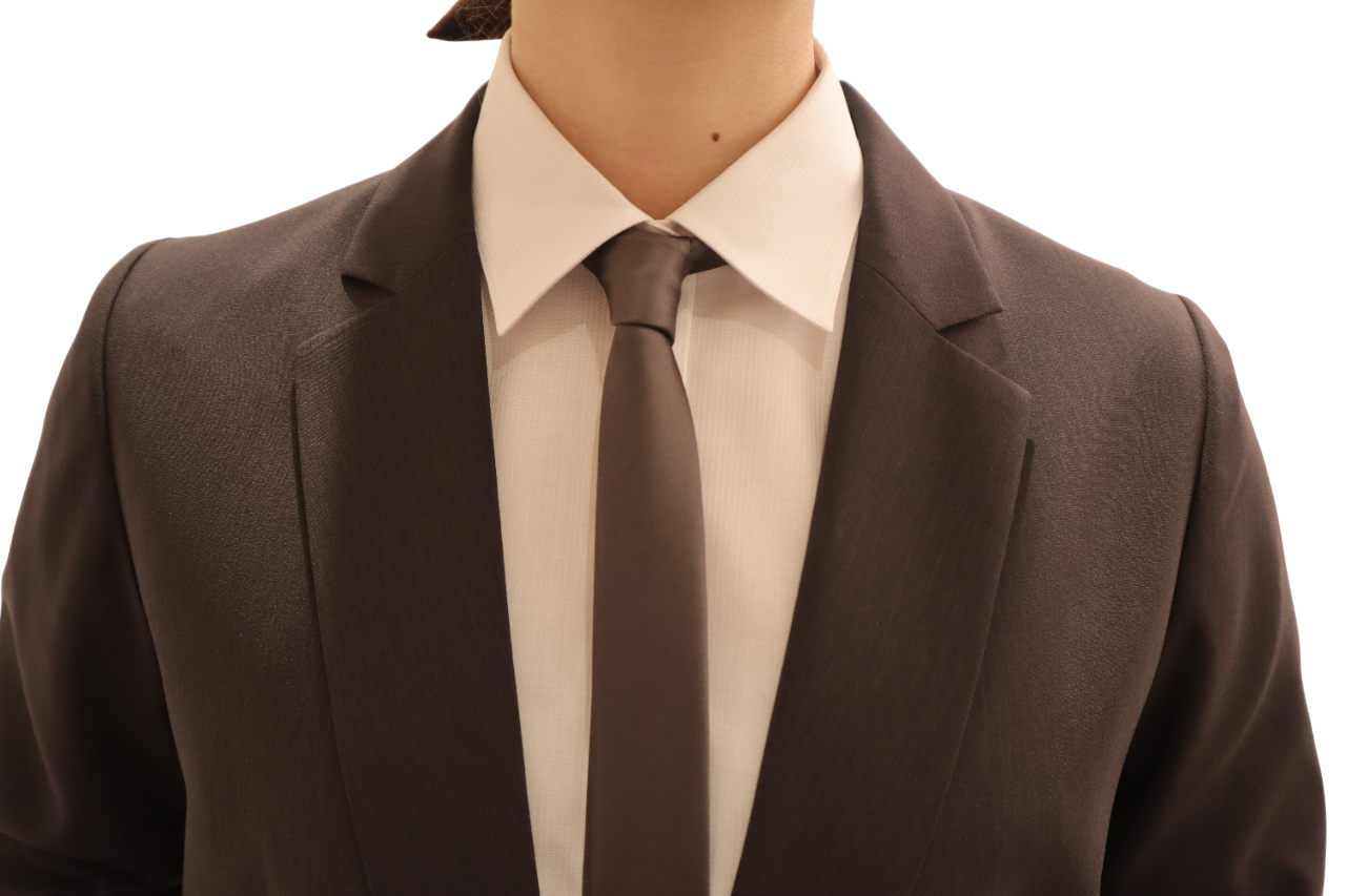 今回発売するネクタイは、ブラウスやレディーススタイルジャケットとの相性を追求した設計となっており、メンズスタイルのネクタイと比べ大剣(剣先)幅は約半分、長さも約6~7センチ短くしました。これにより、ブラウスの襟でも結び目をきれいに収めることに加え、レディースタイルジャケットのコンパクトなVゾーンにおいてもバランスをきれいに取ることができ、顔回りをすっきりさせます。また、光沢感のある生地を採用し、厚みと適度な質感に調整するなど、細部にもこだわりました。