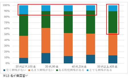 ・「興味がある」と回答した方は20代以下の割合が最も高い