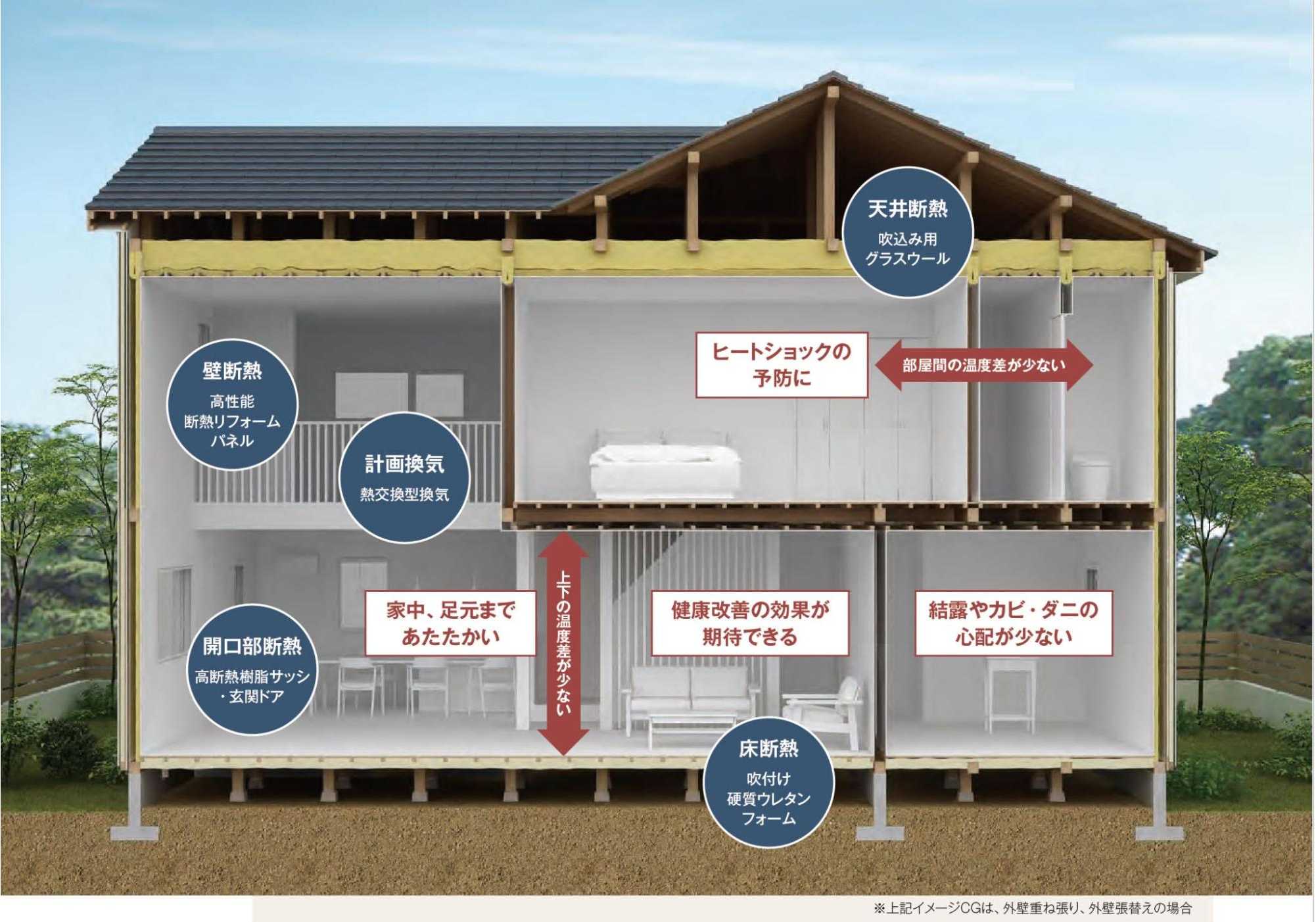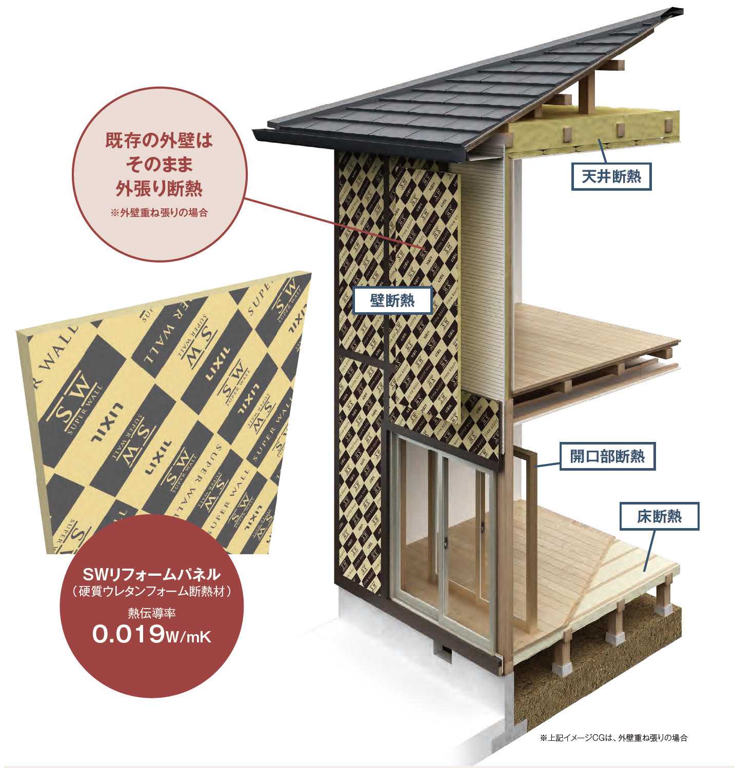 「まるごと断熱リフォーム・SW工法リフォーム」は、国内トップレベルの断熱性能(熱伝導率 0.019W/㎡・K)を誇る硬質ウレタンフォームを使用した壁断熱、吹込み用グラスウールによる天井断熱、吹付け硬質ウレタンフォームによる床断熱により壁・天井・床の断熱性能を高めます。また、既存の窓の断熱性能を高める内窓の設置や、玄関ドアの交換による開口部断熱を組み合わせ、家全体をまるごと断熱リフォームし既存の住宅を省エネ住宅へ生まれ変わらせます。