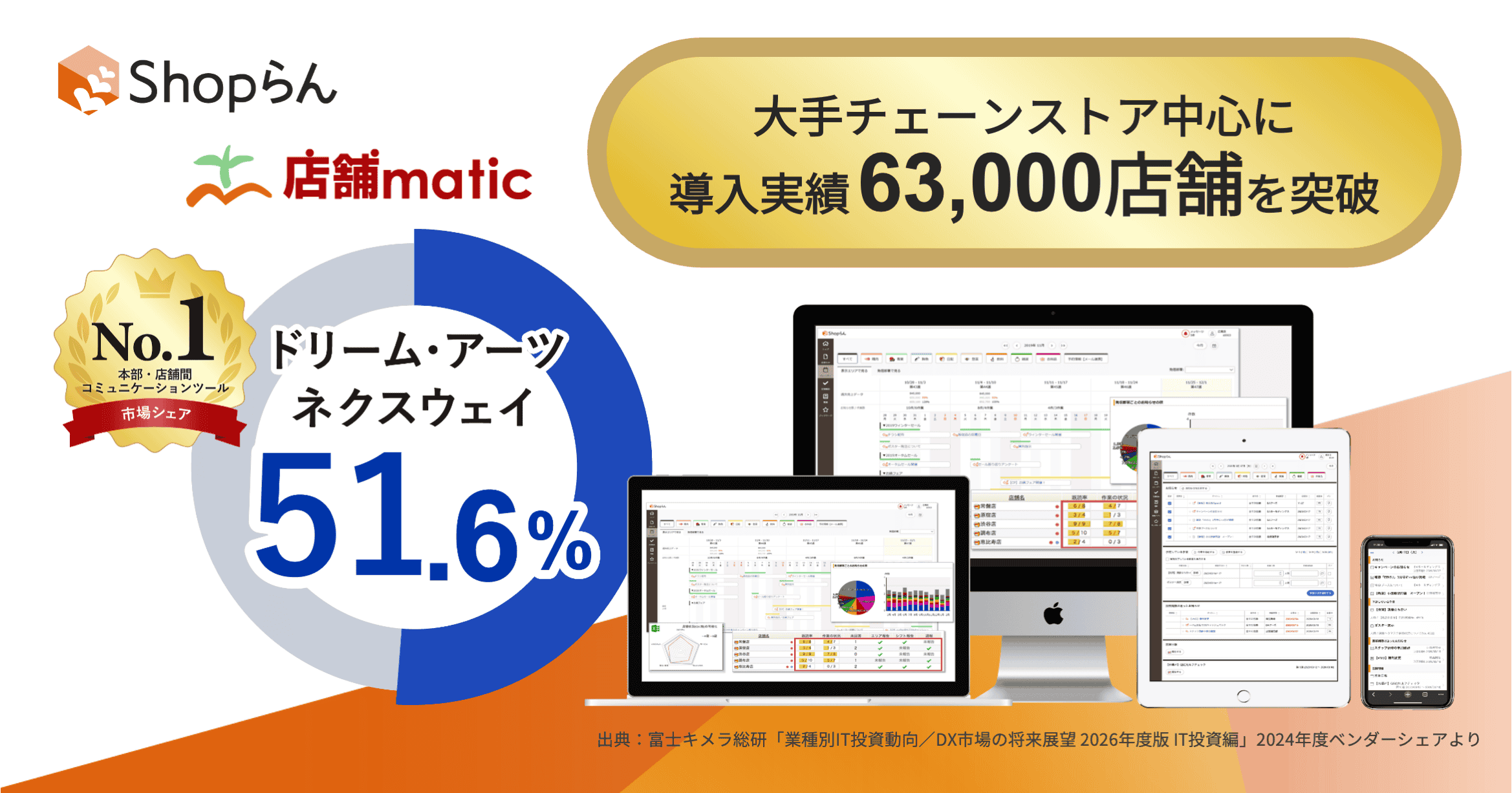Shopらん(R)(ショップラン)/店舗matic(テンポマティック)」が、本部・店舗間コミュニケーションツール市場シェア51.6%でNo.1(※2)を獲得したことを発表します。