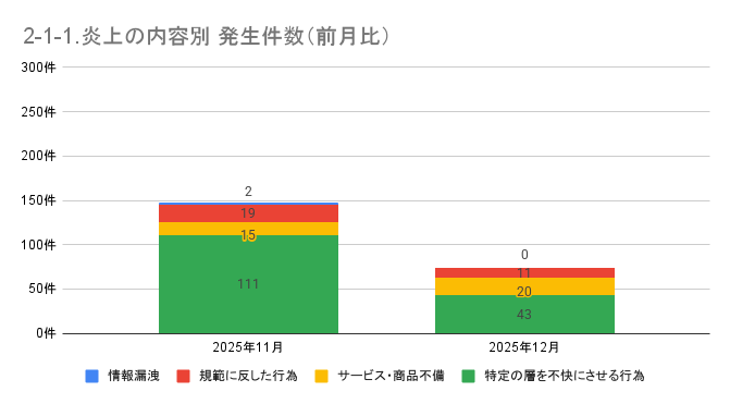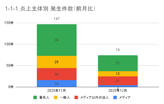 2025年12月の炎上件数は74件と前月比で半減しています。