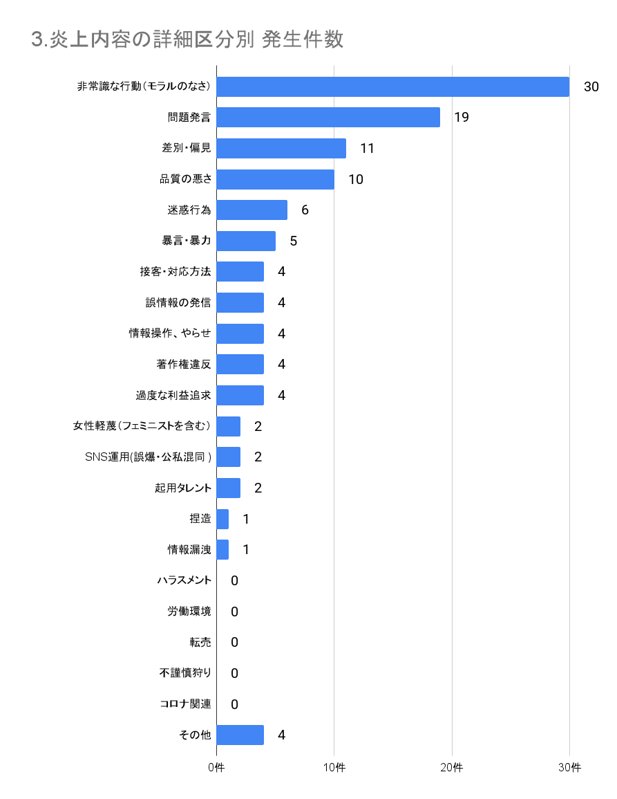 炎上内容の詳細を分析したところ、「非常識な行動(モラルのなさ)」に関する炎上事案が30件と最も多く、次いで「問題発言」に関する炎上事案が19件でした。