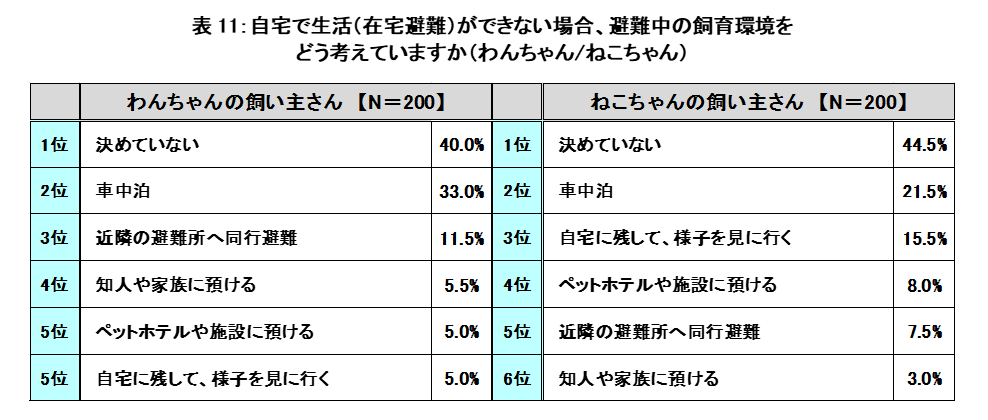 わんちゃんは「近隣の避難所へ同行避難」(11.5%)が3位で、一緒に避難したいという飼い主さんが多い一方、ねこちゃんは4位に「ペットホテルや施設に預ける」(8.0%)など、安心できる環境を確保してあげたいと考える飼い主さんが多いことが分かりました。