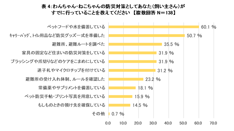 ※、「ある程度準備している」(25.5%)※と回答した人(34.5%)に、防災対策としてすでに行っていることを尋ねたところ、1位「ペットフードや水を備蓄している」(60.1%)、2位「キャリーバッグ、トイレ用品など防災グッズ一式を準備した」(50.7%)という回答になりました。