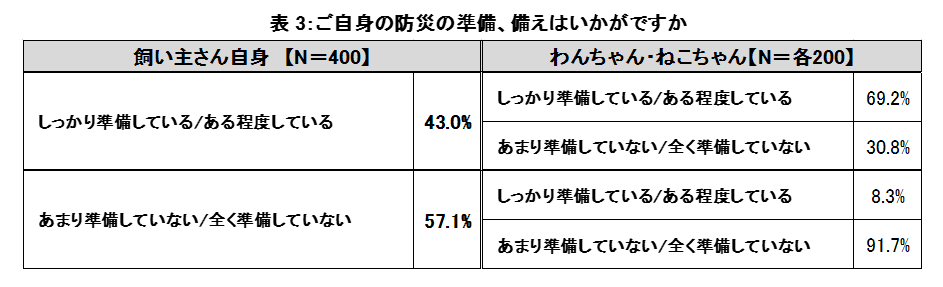 ※を合わせた半数以上の飼い主さん(57.1%)が準備をしていないと回答。そのうち9割以上(91.7%)がわんちゃん・ねこちゃんの防災の備えもしていないことが明らかになりました。