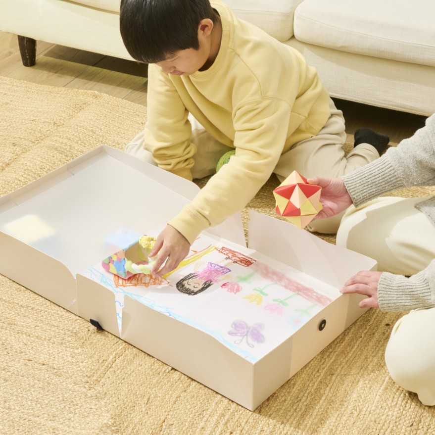 その「作品思い出ボックス」に、この度、立体作品も収納が可能な特大サイズ ホワイトをラインアップしました。「おかたづけシリーズ」のラインアップ拡充により、親御さまやお子さまのお悩みを解決し、日々の生活を豊かにできるよう、今後も様々なご提案を続けてまいります。