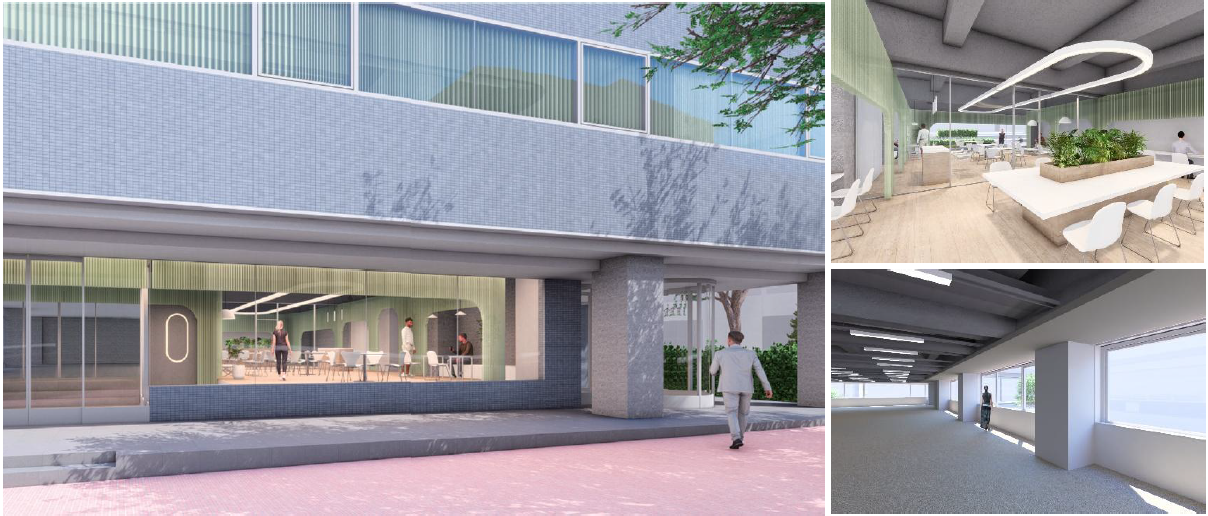 さらに1階は、テナント区画とオフィス専用ラウンジを計画し、間仕切りにより機能を分けます。オフィス専用ラウンジは、集中して仕事をする場所、イートインスペース、外部ゲストとの打合せやイベント開催等、多様な使い方を受け入れる共用拠点として整備し、テナントのウェルビーイングの向上や生産性・利便性の向上につなげます。