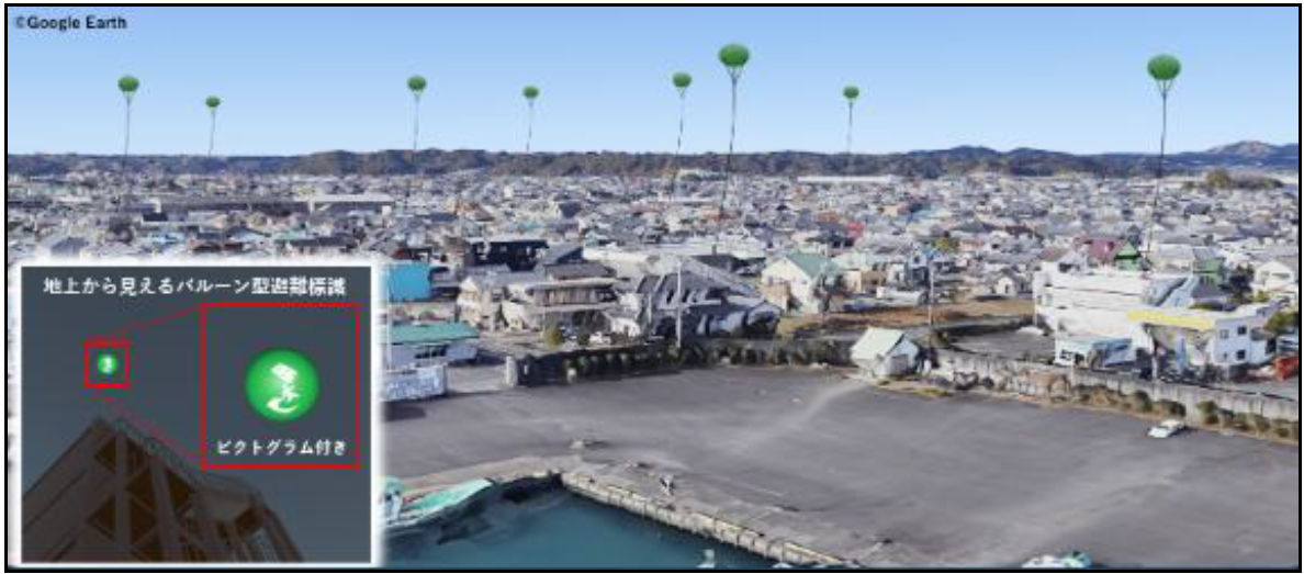 「津波バルーンプロジェクト」は、準天頂衛星システム「みちびき」から配信される災危通報(津波警報や緊急地震速報)を受信し、バルーンを自動で上空へ展開するシステムを開発する東北大学の技術チームです。本実証では、その一連の動作試験が実施され、津波警報(試験配信)の受信後にバルーン内部にガスが高速充填され、直径2m程のバルーンが約2~3分で地上から約40mの高さまで掲揚されます。バルーンには人型ピクトグラムが描かれており、避難時に空を見上げるだけで避難施設の位置を把握できるよう設計されています。夜間にはEnerCeraを電源とするLEDが点灯し、避難者を視覚的に誘導します。