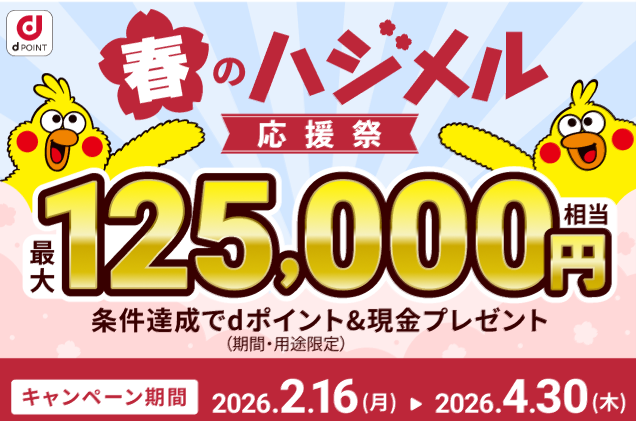 本キャンペーンの開催にあわせ、「d NEOBANK」の新規口座開設およびその他条件達成で最大125,000円相当をプレゼントする「春のハジメル応援祭」キャンペーンの特設ページを開設しました。