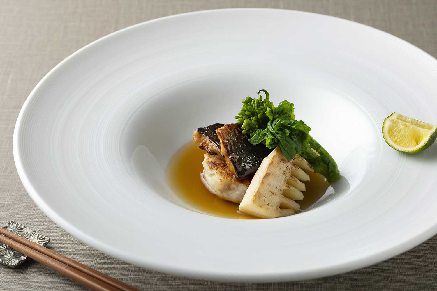 今春は、奈良県が誇る和牛「大和牛」をはじめ、シェフが奈良県の生産者を訪問し、作り手の姿勢に触れて感銘を受け、選び抜いた食材を中心にコース料理を構成いたしました。吉野晒(よしのざらし)の製法を150年以上守り続ける天極堂の吉野本葛のほか、江戸時代から天日干しの製法を受け継ぐ嘉兵衛本舗の番茶、奈良県産大豆にこだわり、在来種の豆「大鉄砲大豆」を復刻して作った豆腐や醤油、奈良県の柿を多様な加工品に仕立てる「柿の専門」の柿酢など、生産者の思いが伝わる食材を取り入れております。