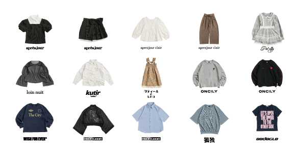 apres jour(アプレジュール)、apresjour clair(アプレジュール クレア)、Palelfy(パルエルフィー)、kutir(クティール)、EllnoLoset(エルノロゼット)、KODOKU(コドク)、sedacle(セダクル)、LOIN NUIT(ロワンニュイ)、WISHFOREVER(ウィッシュフォーエバー)、ONCILY(オンシェリー)