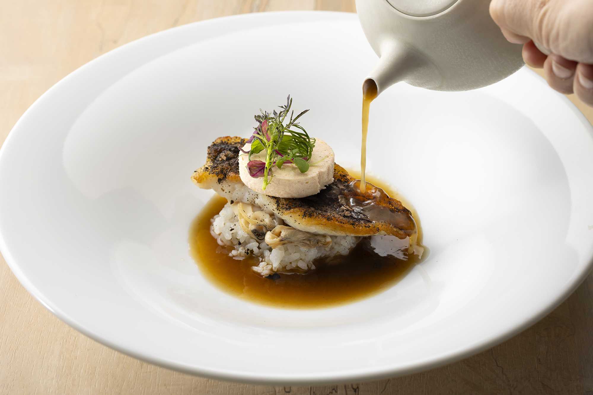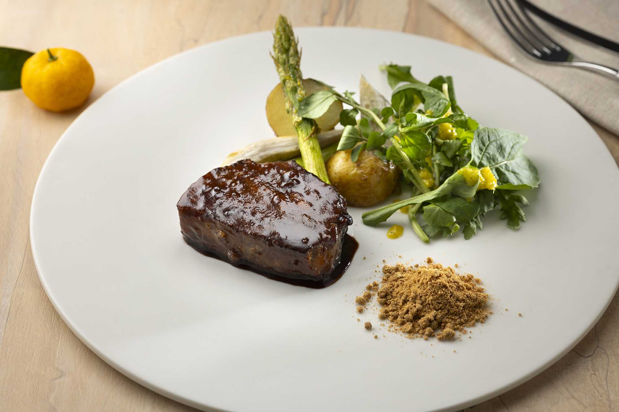 今回のコースで特におすすめしたいのは、魚料理と肉料理です。魚料理に添えた番茶の茶葉は、生産者の方から「そのまま味わってほしい」と言われたことを受け、料理に添えました。少し砕いて料理に合わせると、番茶の香ばしさがより引き立ちます。肉料理のなにわ黒牛はブレゼしており、そのままでも味わえますが、添えたきなことともに食べると印象が変わります。大和大鉄砲は大豆そのものの甘みが強く、そのきなこを合わせることでソースに自然な甘さが重なり、独特の風味が生まれます。素材の個性をいかした料理の数々を楽しんでいただければと思います。