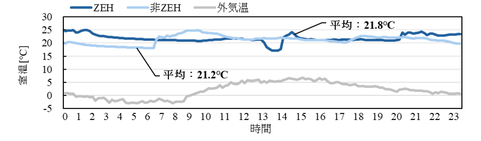 ZEH・非ZEH代表住戸における冬季(2/20)の居間室温