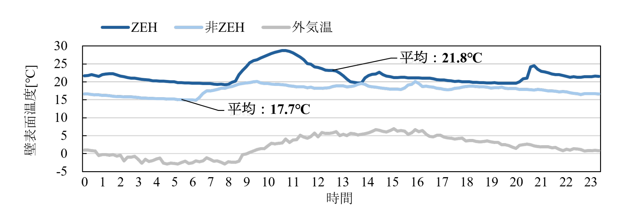 ZEH・非ZEH代表住戸における冬季(2/20)の壁表面温度