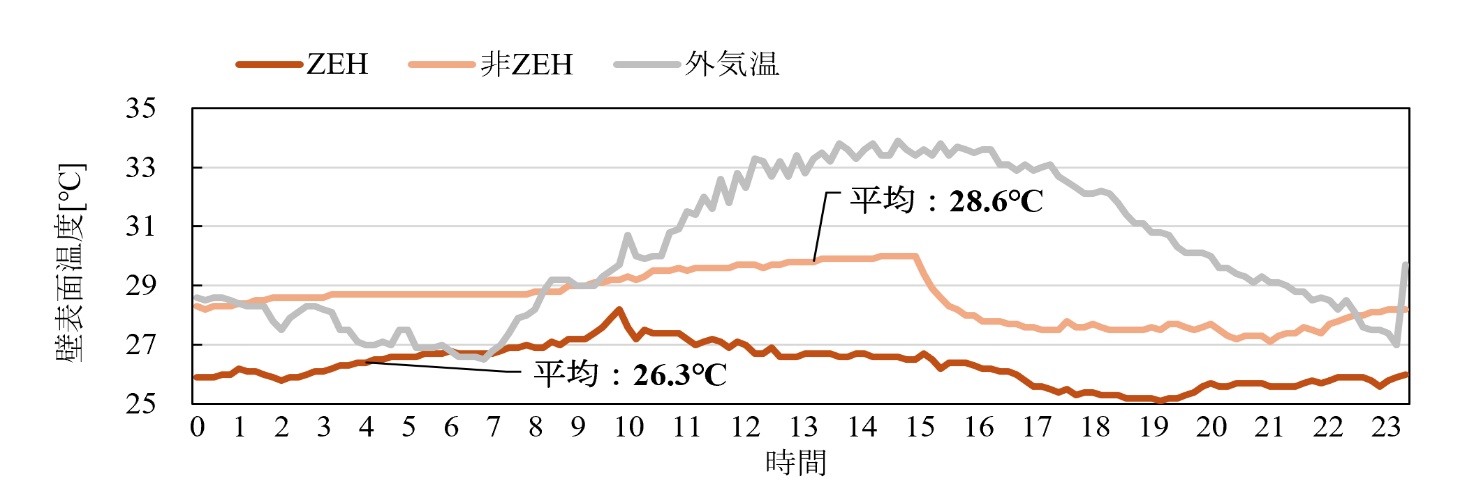 ZEH・非ZEH代表住戸における夏季(9/15)の壁表面温度