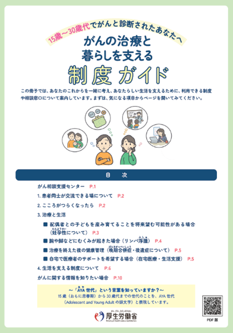 厚生労働省では、このたび、AYA世代(Adolescent and Young Adult:15~39歳)のがん患者が、適切な支援制度やサービスにつながるための契機となる広報資材として、パンフレット「15歳~30歳代でがんと診断されたあなたへ がんの治療と暮らしを支える制度ガイド」を作成しました。
