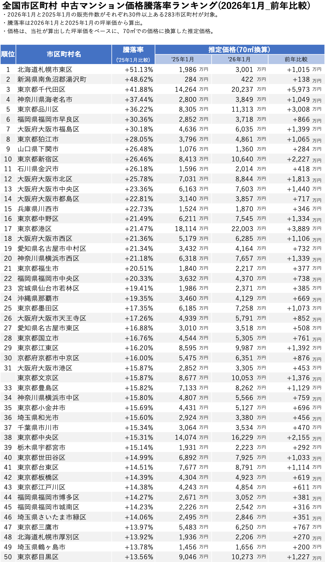 - 1位 北海道札幌市東区 : 騰落率 +51.13%