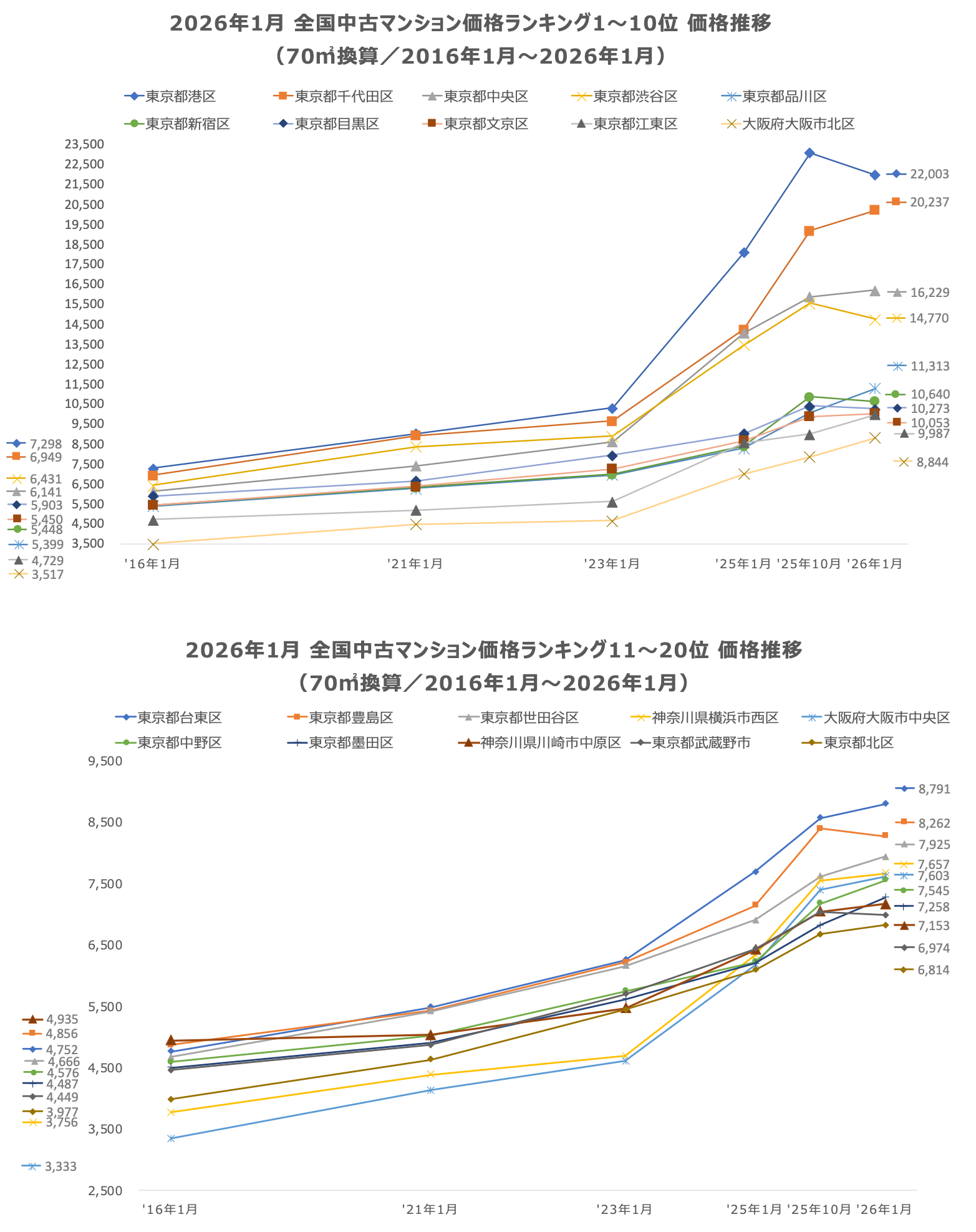 「不動産×WEB×ビッグデータ」の領域で、さまざまな不動産テックサービスを展開する株式会社ワンノブアカインド(本社:東京都港区、代表取締役社長:川島 直也、以下当社)は、当社が運営するマンション情報サイト「マンションレビュー」の保有データを元に、2025年12月の全国市区町村における中古マンションの相場を調査。坪単価をベースに70㎡の価格に換算した「中古マンション価格」*1と価格ランキング上位20件について過去10年間の価格推移、および1年前からの価格上昇率を表す「騰落率」のランキングを発表いたします。