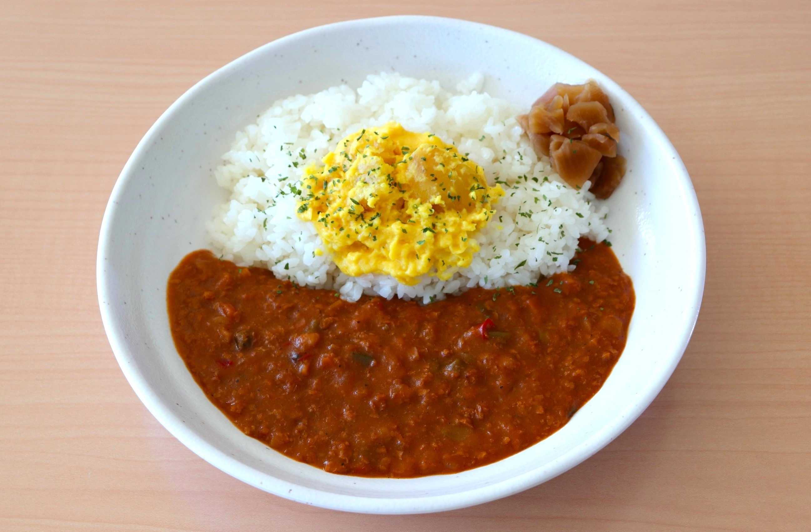 玉ねぎ、人参、蓮根、馬鈴薯、インゲン、ピーマン、トマトの7種から作ったキーマカレー風の野菜カレーに、キユーピーが独自の技術で開発した植物性原材料をベースにした「HOBOTAMA スクランブルエッグ風」を添えました。彩りも鮮やかに、シェフが手作りした本物の卵のような半熟感の味わいをお楽しみください。