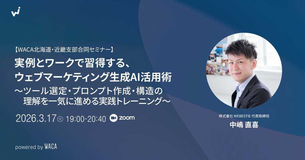 一般社団法人ウェブ解析士協会(WACA)は3月17日(火)、オンラインセミナー「実例とワークで習得する、ウェブマーケティング生成AI活用術」を開催します。マーケティングでAIを使いこなすため、21種類のフレームワーク作成を「自動」で終わらせるデモを実演。さらに、音声入力(バイブス)を利用した3段階プロンプト進化論を公開します。